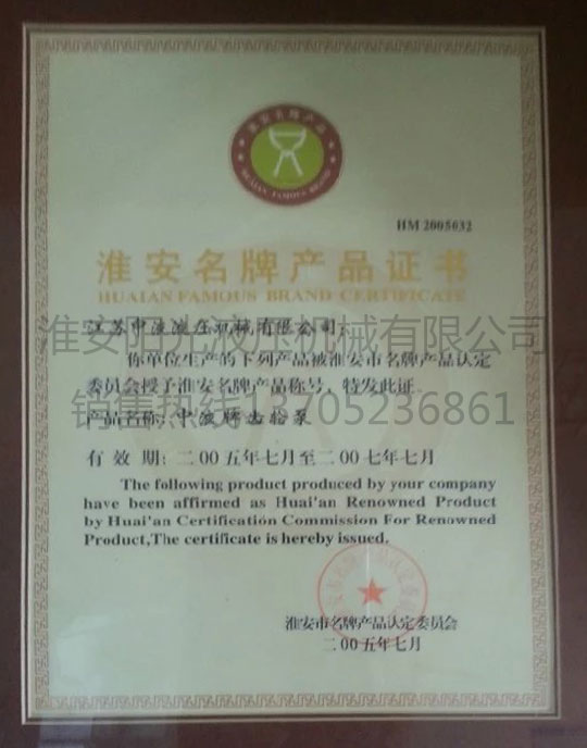 淮安名牌產品證書